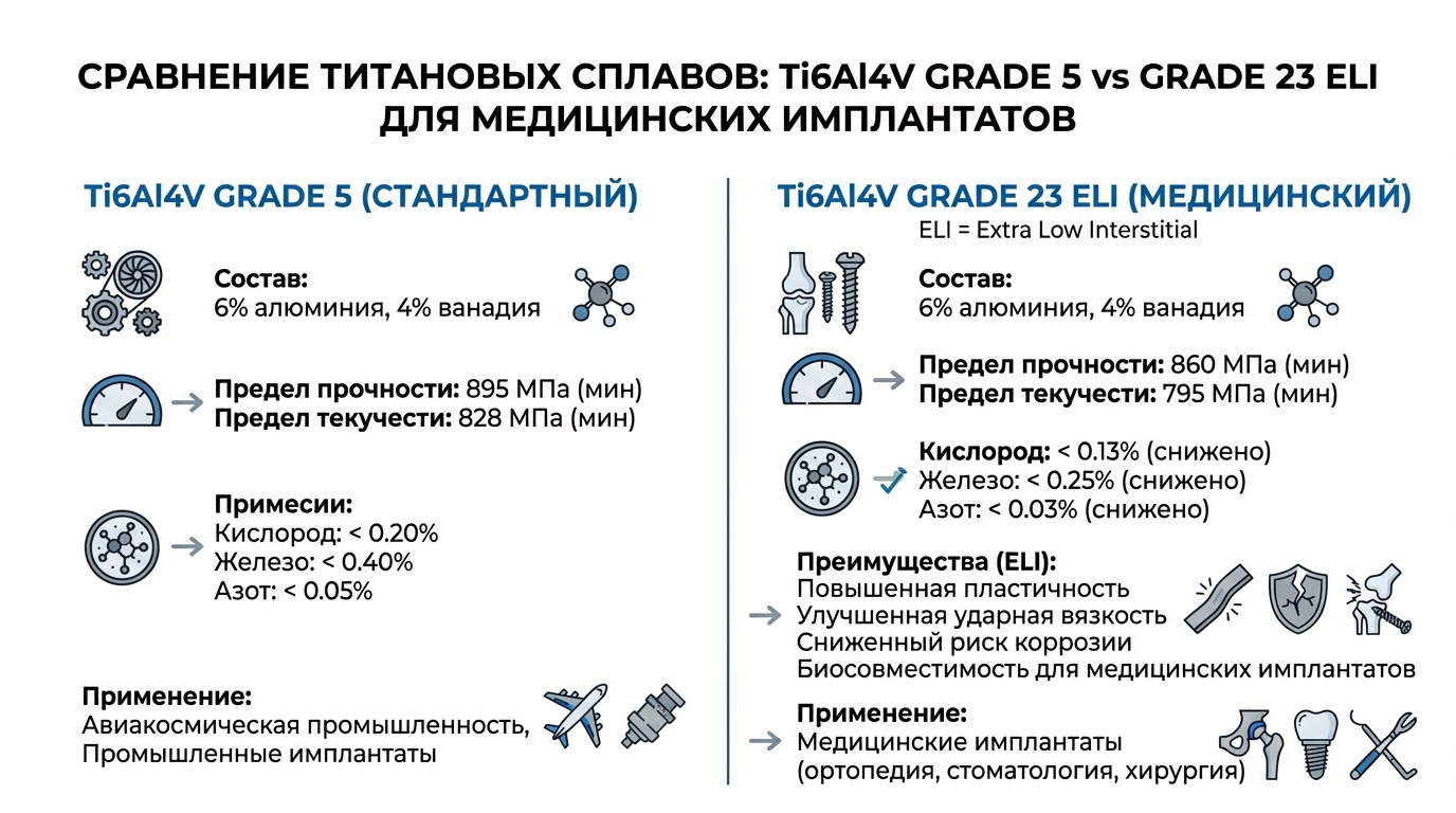 Версия сплава с экстра-низким содержанием примесей внедрения (Ti6Al4V ELI, Grade 23) разработана специально для медицинских применений. Кислород, азот, углерод и водород в титане располагаются в междоузлиях кристаллической решетки, и их избыток приводит к охрупчиванию металла. В Grade 23 содержание кислорода ограничено 0,13% против 0,20% в стандартном Grade 5, железа — 0,25% против 0,40%, азота — 0,03%.