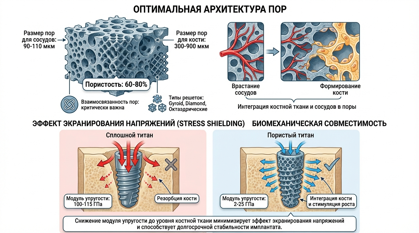 Пористые структуры обеспечивают остеоинтеграцию — врастание костной ткани в поры размером 300–900 мкм. Это создает надежную биологическую фиксацию без необходимости использования винтов или костного цемента. Дополнительно пористость снижает эффективный модуль упругости имплантата, предотвращая атрофию окружающей кости из-за эффекта экранирования напряжений.