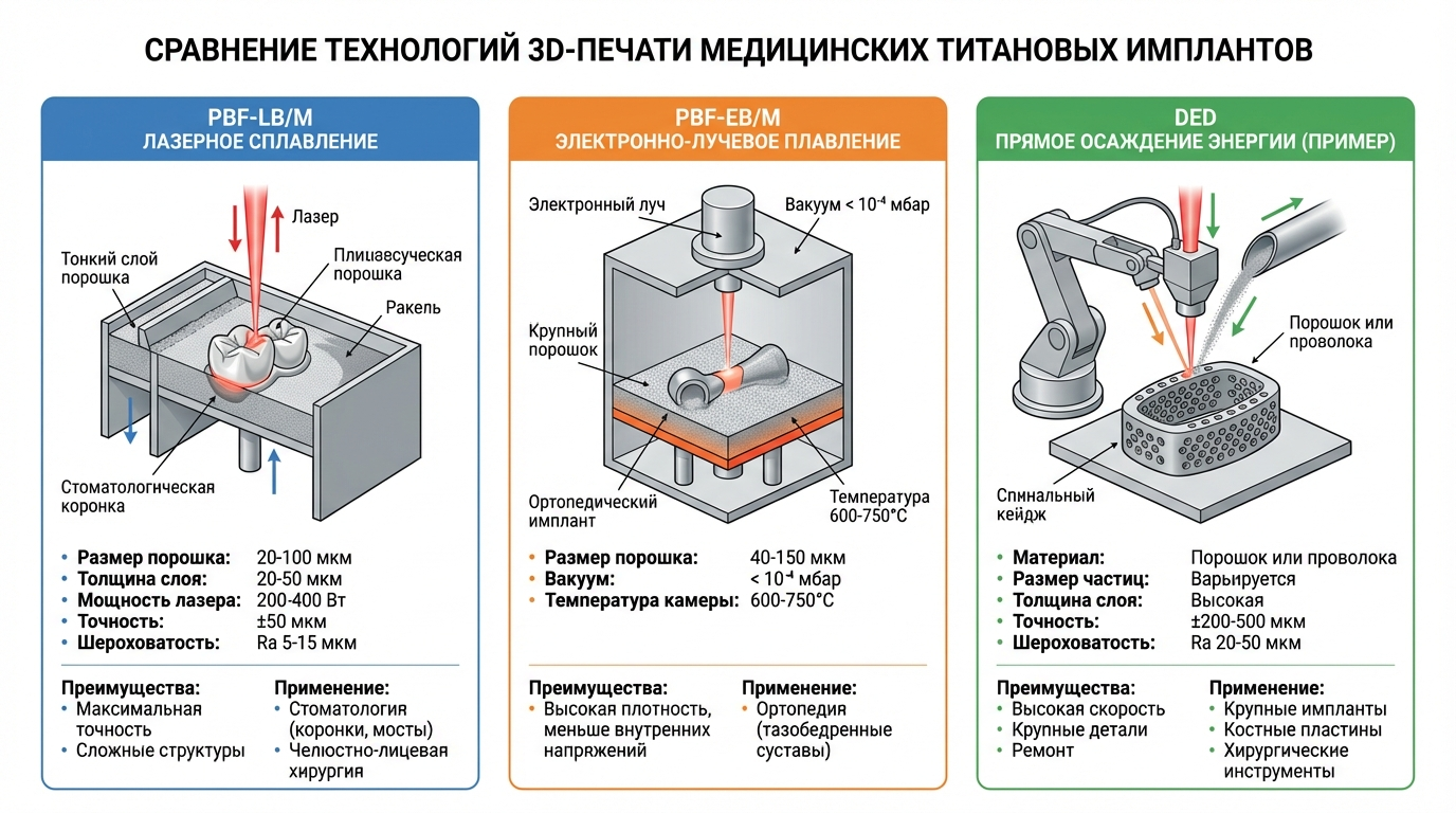 DED незаменим для ремонта дорогостоящих имплантатов и создания изделий с градиентной структурой — например, с переменной пористостью по толщине. Производительность наплавки существенно выше, чем у порошковых методов, но точность и качество поверхности уступают.